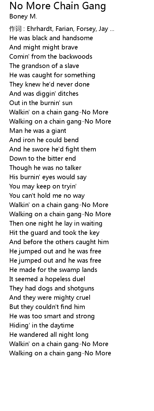 Boney M No More Chain Gang Lyrics / Lyrics © original writer and publisher.