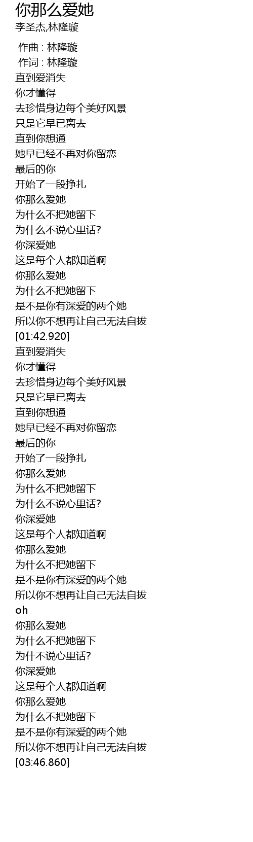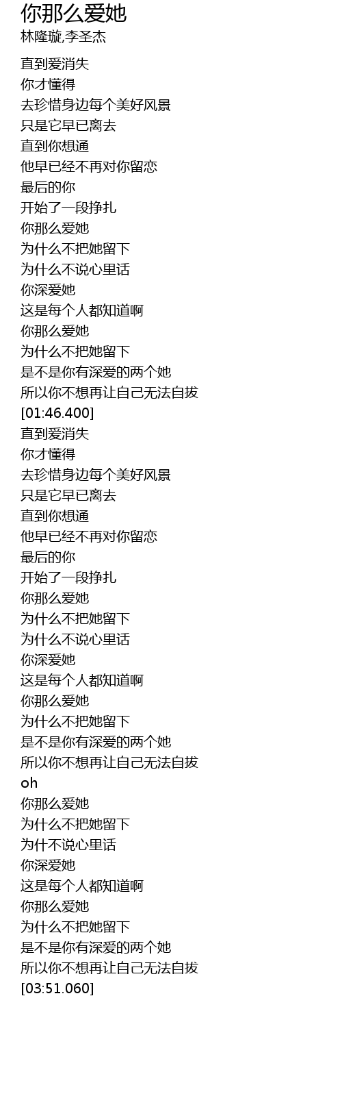 Ni Na Me Ai Ta / * 直到愛消失 你才懂得 去珍惜身邊每個 zhi dao ai shao shi ni cai dong de qu zhun shi shun bian mei ge 美好風景 只是她早已離去 mai hao feng jing zhi shi ta zao yi li qu 直到你想通 她早已經.
